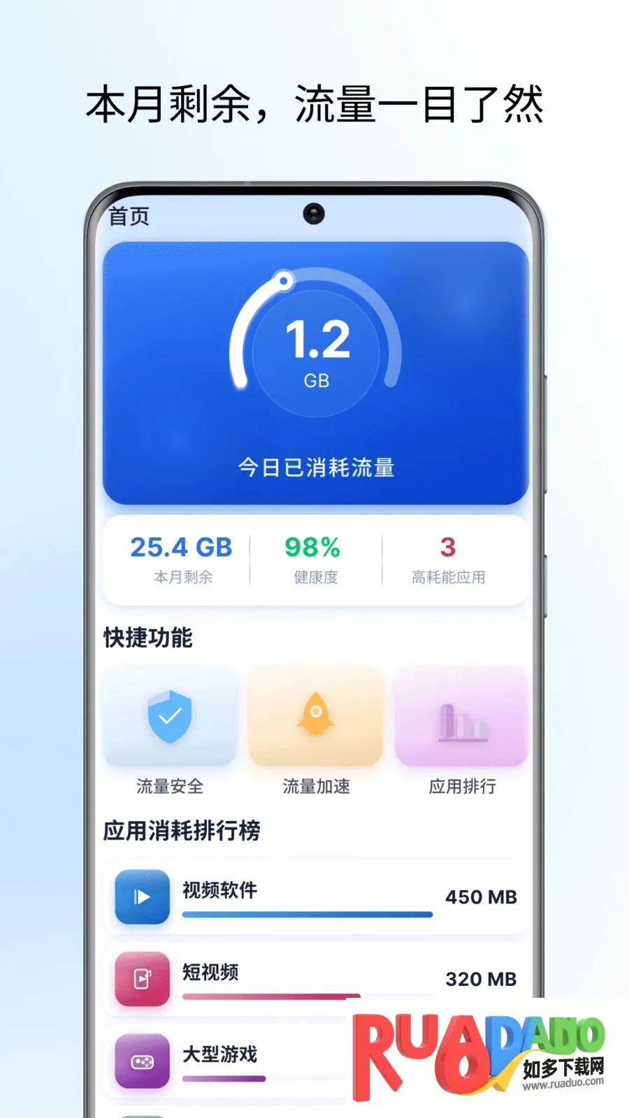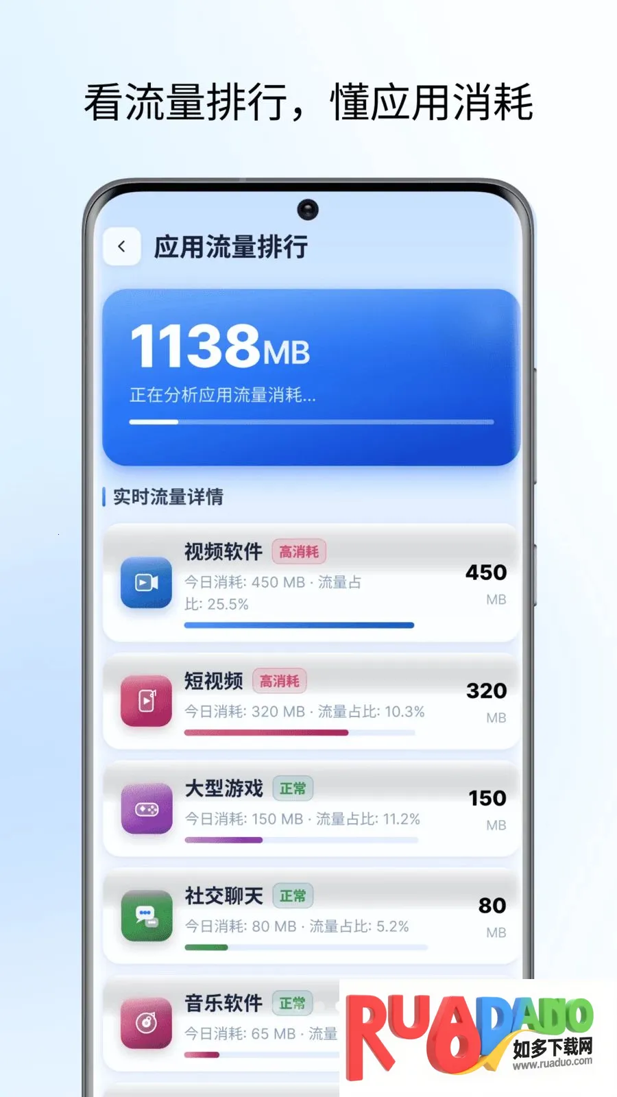 2. 支持实时流量统计、应用消耗排行、网络测速等,功能丰富实用。