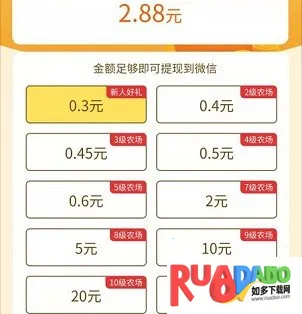 多多农场是一款超有趣的种植赚钱应用软件。在这里,你能自由选择种植各种蔬菜农作物,通过在线种植来赚取报酬奖励,收益到账极速。软件玩法丰富,可邀请好友一起娱乐,还能打发无趣时间并赚取高额奖励。每天会更新不同任务,利用空闲时间就能娱乐赚钱。新人下载送 18800 金币(相当于 1.88 元),首次满 0.3 元即可提现秒到账,后续还有 0.5 元低门槛提现额度。静态收益超高,升级果树浇水能获大量金币现金奖励,活跃 30 天必得价值 2030 元当季畅销水果且免费包邮到家。红包奖励高,能绑定微信钱包通过转账、红包转出。点击闲置土地种上蔬菜水果,耐心等待收获,不同品质作物报酬不同,用报酬扩建农场、解锁更多作物与道具,让你轻松体验赚钱乐趣。