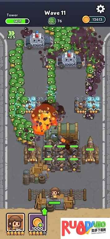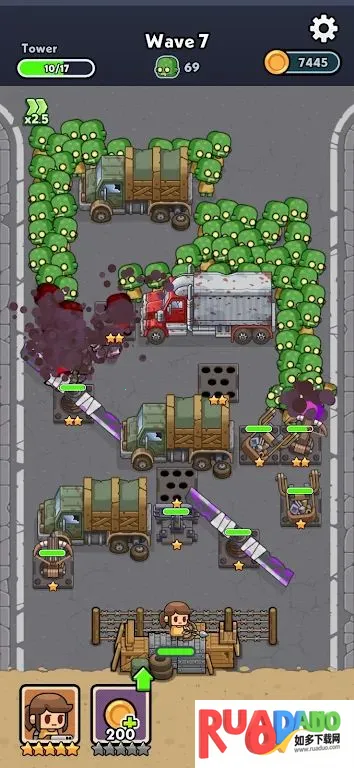 4、购买不同类型塔楼并升级,排列塔楼形成有效路径消灭浪潮,每波幸存可赚金币再投资强化防御,智胜僵尸,改进塔楼设置,看能生存多久。