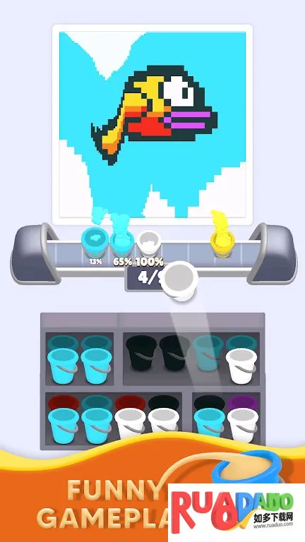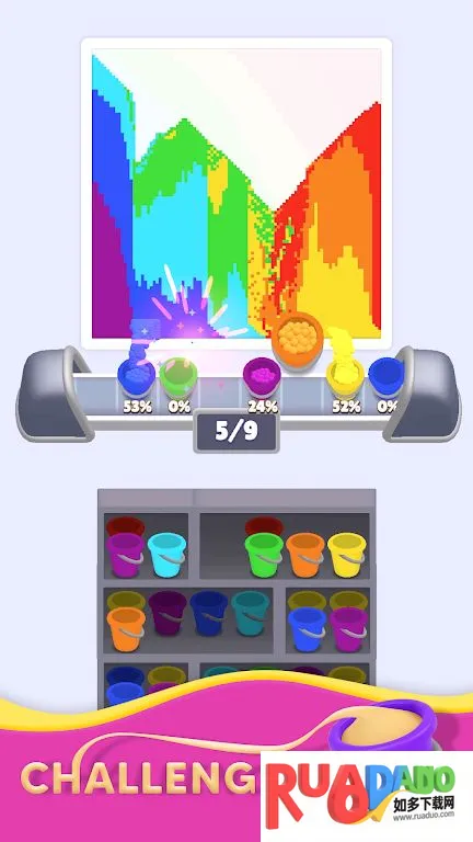 1. 轻松的颜色分类益智玩法,选择正确桶收集匹配沙子完成沙画。