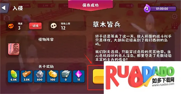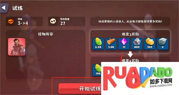 点击入侵之后,可以看到右上角有一个试炼按钮。点击试炼,会升级难度,增加敌人数量及战力。但是后续可以获取更多的紫宝石哦!