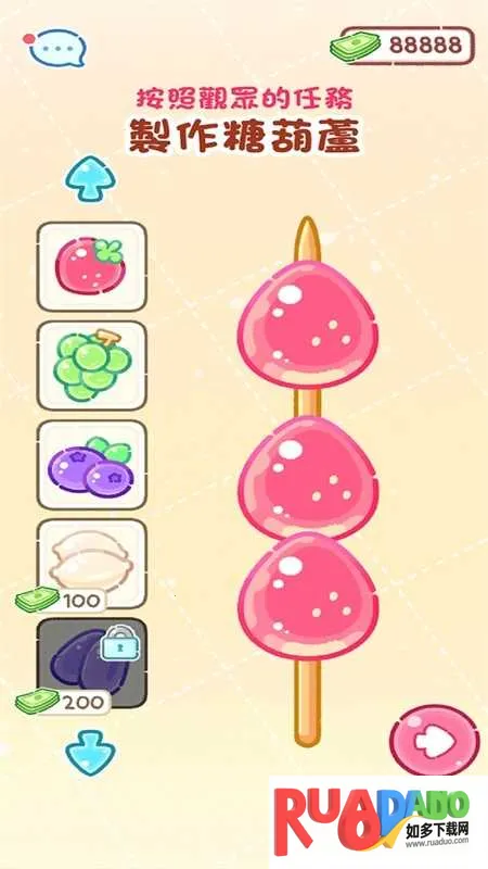 2、游戏玩法简单,点击屏幕即可制作。仅用水果难以立足,需利用松饼、地球软糖、青阳辣椒等奇特材料打造特色糖葫芦。