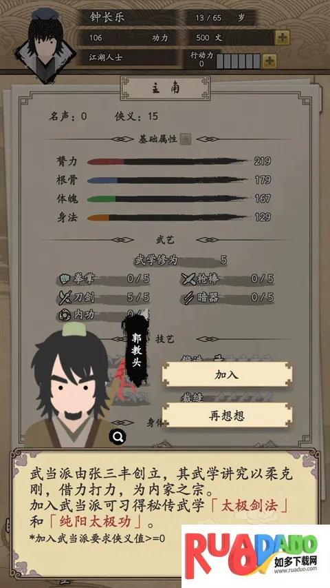 我的武侠梦是一款以明朝永乐年间为背景的武侠角色扮演游戏。玩家作为初出茅庐的侠客江湖冒险,可体验多职业,自创武功。破解版能使用无限武功秘籍技能点和无限金币,助你书写武林传奇。