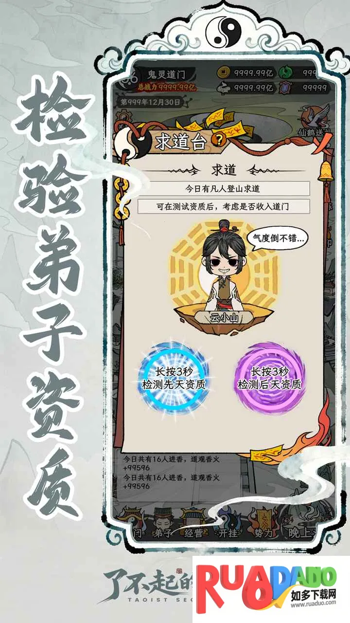 2. 招募弟子过程奇葩,有先天道体天才,也有白吃白喝关系户,管理考验你的抉择。