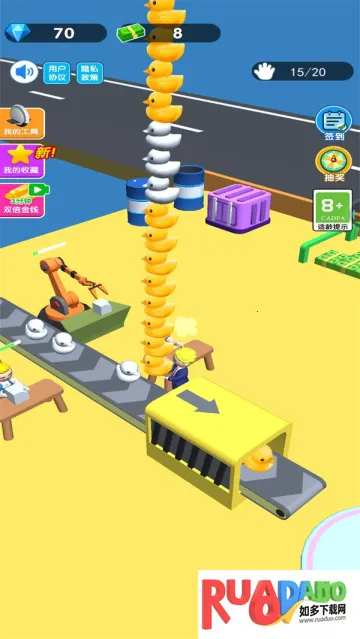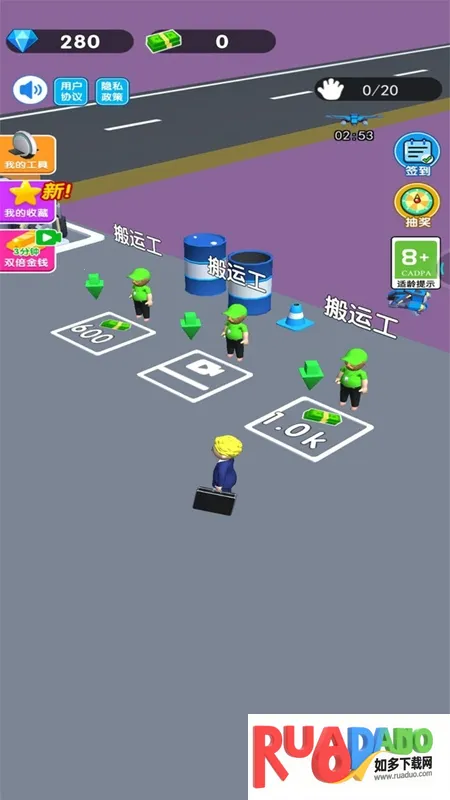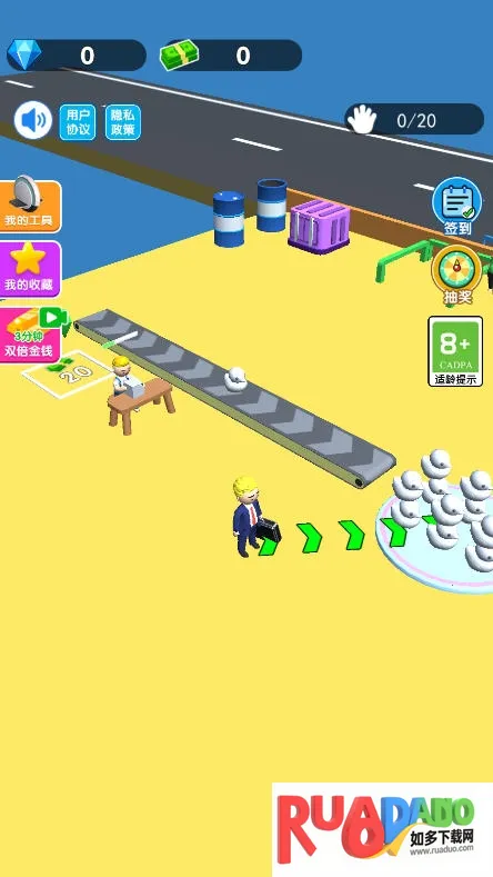 1. 玩家能扮演刚创业的小老板,通过搬运玩具赚第一桶金,解锁搬运工人、扩大车间、提升效率,赚取更多金币解锁关卡和车间。