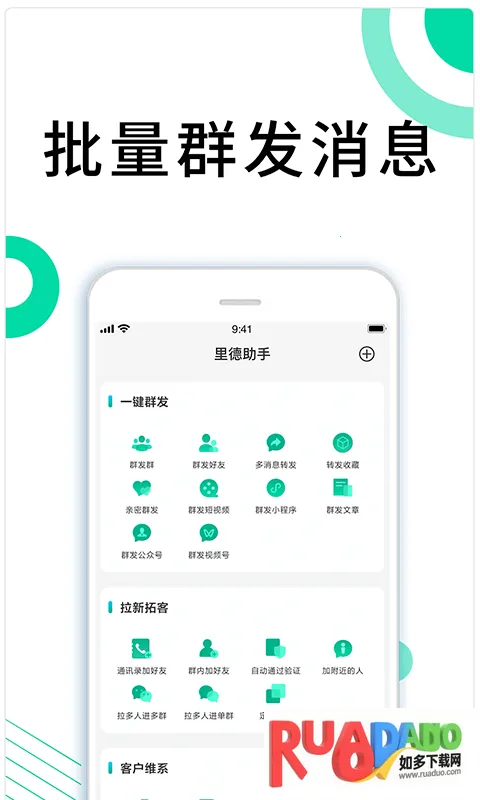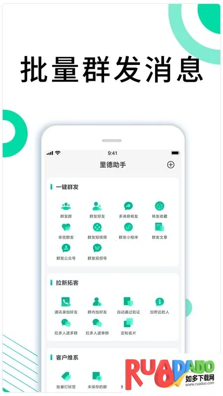 用里德助手Plus不用担心封号问题!它专为打造高效安全稳定的微信运营环境设计。能智能辅助操作微信来引流拉新、拓客、管理客户关系、维护联系人等。比如开启加好友辅助功能,自定义验证语、时间间隔、添加位置等参数,可智能处理微信好友申请,降低封号风险。也支持批量管理标签好友、修改备注等,还能自助制作个人电子名片、一键打造个人IP、收藏好友名片。有检测未保存到通讯录群聊的功能,能一键找回有价值的群聊。按标签拉好友进群也很便捷高效。而且它操作简单,像一键自动将目标图片切成九宫格、秒拼长图、秒换头像这些功能,能快速生成宣传图与个性化形象素材,让你的微信运营轻松又高效,是提升效率的贴心助手。