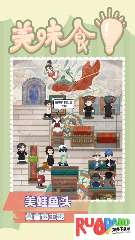 1. 游戏以经营饭店为主题,可选择开不同主题、不同美食的餐馆,如古韵中式、绿色植物、莫高窟、可爱萌宠等主题,以及火锅店、川菜馆、小龙虾店等。