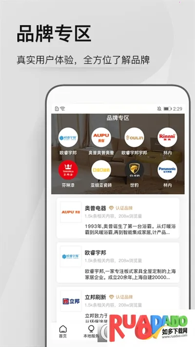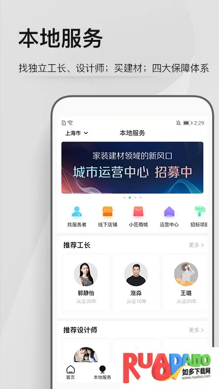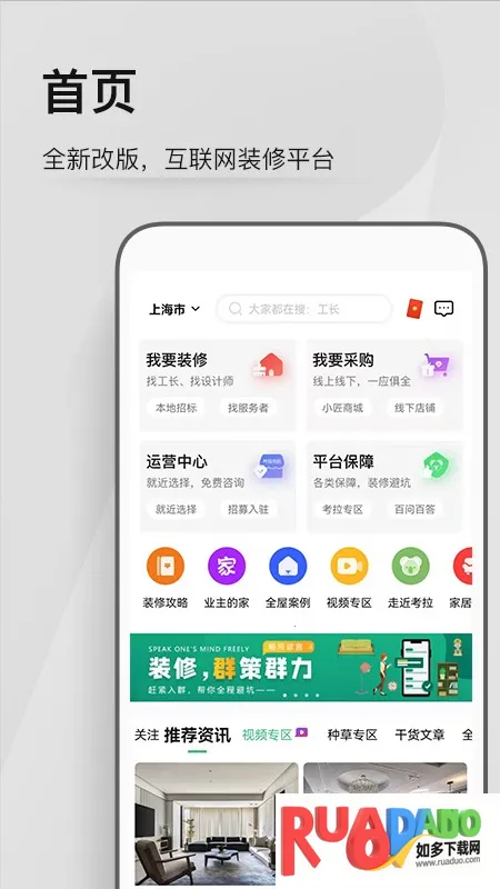 2. 首页提供装修采购、家装攻略等丰富内容,本地服务能找到所需工人、设计师等,品牌服务可获取品牌情况。