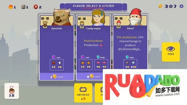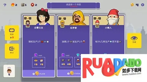 4、还能随机选新市民,每个有独特属性,选择好后开始新回合,看他们发挥特长产资源金币。