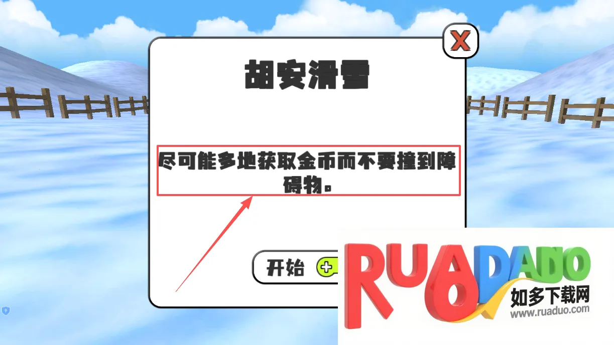 3、进入具体游戏比如胡安滑雪后,先读一下玩法提示,目标是多拿金币别撞障碍,然后点击底部的开始按钮,游戏就正式开始了。