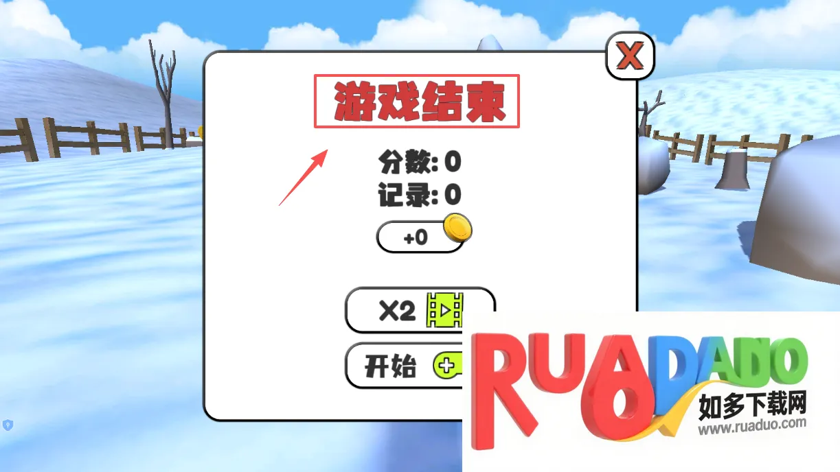 4、游戏结束后会出现结算界面,你的分数和破纪录情况都会显示,可以用金币奖励尝试翻倍,或者直接点击开始按钮重新再来一局。