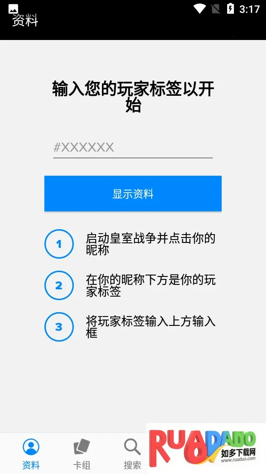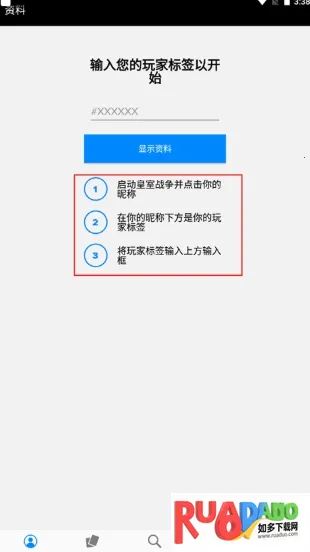 在上方显示XX的地方输入你玩家昵称下方的标签,就能显示您作为皇家战争玩家的所有资料。