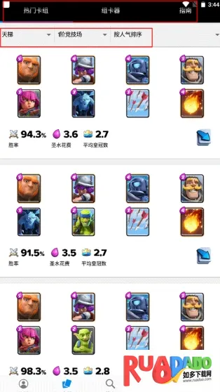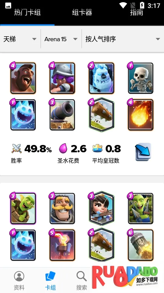 卡组主要分为热门卡组、组卡器和指南这三大块,热门卡组从天梯、竞技场等级以及人气这三个元素来筛选;组卡器就是通过你的卡牌来进行收藏;指南就是包含卡组的玩法攻略。