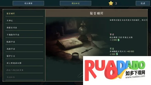 3. 科技树与政治制度相互影响,玩家能依发展方向做关键抉择,塑造独特国家路线。