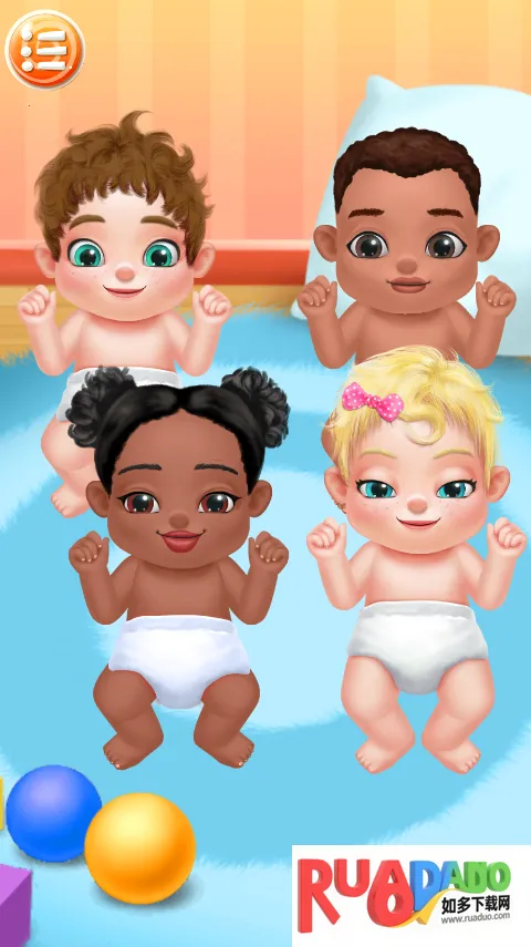 1、在本站下载安装该游戏,打开进入点击播放键,这里有四个宝宝,你要先把每个宝宝都哄开心,点击逗弄他们就行。