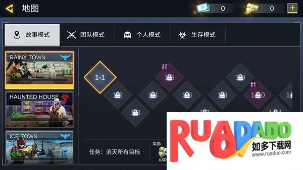 2、玩家在游戏中可以选择自己喜欢的模式进行畅玩,其中提供了故事、团队、个人、生存模式这四种玩法模式可以体验;