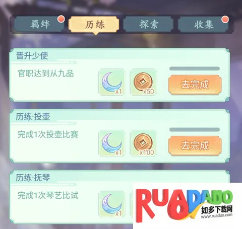 历练成就目前只有官职、投壶、抚琴三个成就任务,完成就可领取成就奖励。