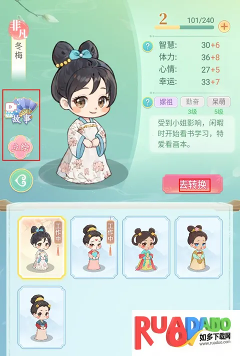 1、完成采女选拔后就会变为宫女,玩家在宫女页面可以查看其信息,还有专属故事以及立绘可以查看。