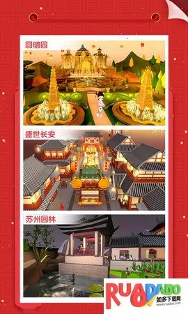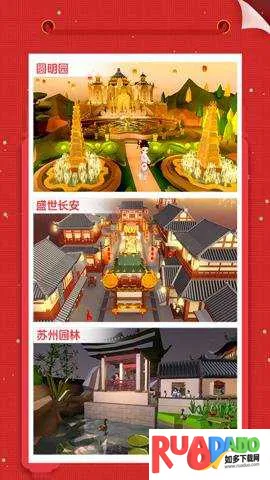 1. 3D 形式展现世界各地风景名胜、特色风情与标志性建筑,如埃菲尔铁塔、自由女神像等都能建造。