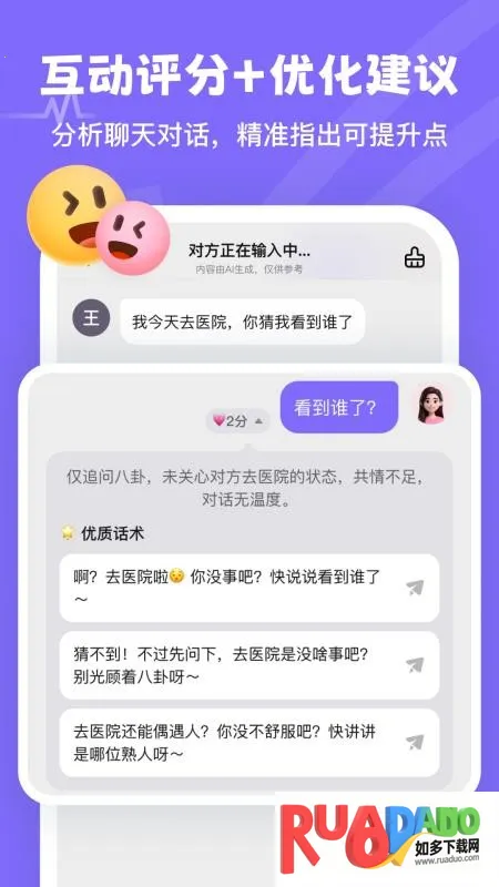 Miss恋爱教练2026官方正版能为用户带来诸多便利。它可以输入对方资料模拟真实对话场景,还会根据对方聊天内容生成合适回复,帮助用户轻松聊天。同时,从双视角分析能让用户了解各种话术,对情感的分析也有助于把握双方情感状态,让恋爱交流更加顺畅,是恋爱中的实用工具。