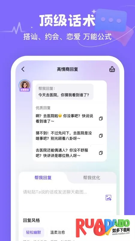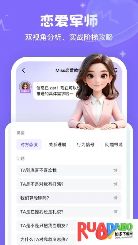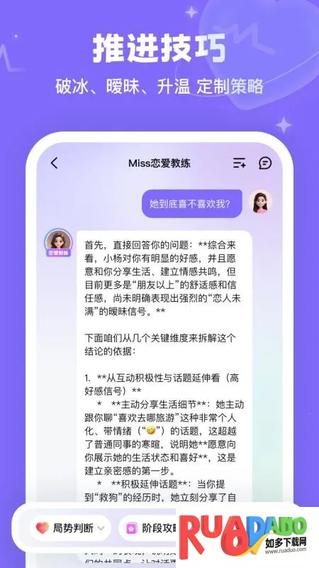 Miss恋爱教练2026官方正版是一款恋爱话术指导app。输入对方资料模拟真实人物对话,能根据对方内容生成合适回复,从双视角分析,助你了解话术、情感状态,提升聊天情商,让恋爱轻松破冰。