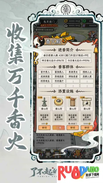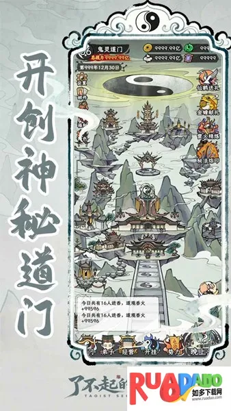 想体验独特的道门经营养成吗?《了不起的道门》就能满足你!在这里,你将扮演落魄道观观主,从零开始复兴宗门。通过求道台招募弟子,用摸骨术判断资质,合理安排修炼,轻松提升宗门实力。经营道观时,建设各类建筑,利用坊市买卖法器赚取资源,还能通过香火殿求签问卦感受国风文化。特色玩法众多,如炼制道器、带领弟子下山除魔抓鬼等,层层递进超有趣。而且游戏采用放置挂机理念,离线也能自动积累资源、提升弟子实力,护肝又轻松。其画面是细腻的国风水墨画风,音效悠扬,让你沉浸在东方仙侠世界。社交系统还能让你与其他玩家交流切磋,分享心得。快来开启你的道门经营之旅,打造属于你的鼎盛修炼圣地吧!