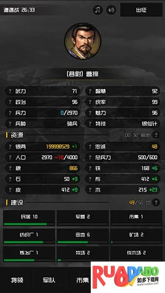 4. 具有Roguelike元素,人口和兵力为0时游戏失败重置,仅保留银两,其他资源包括装备等级减半,失败后重新开始,还有定时遭遇战,需谨慎发展经营。