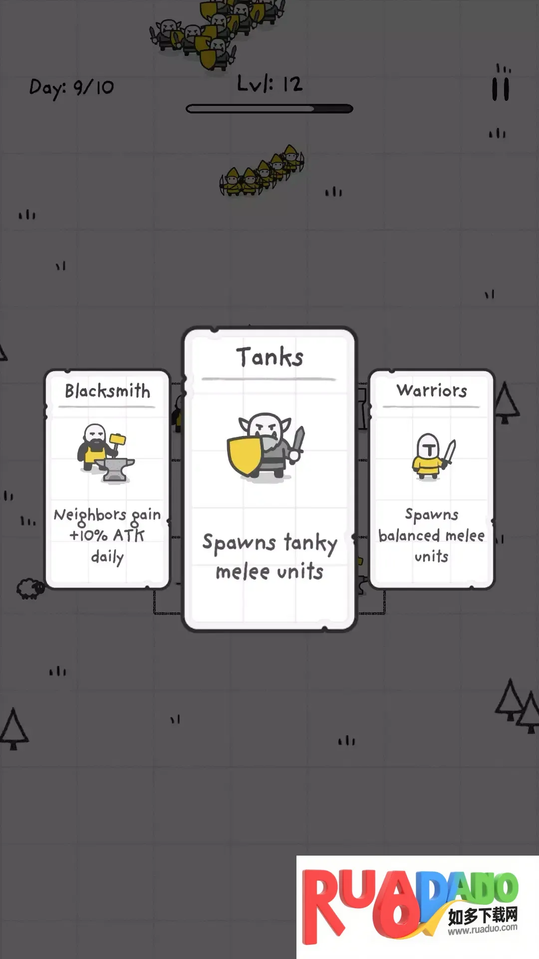 2、选择初始单位,召唤盟友,战斗中升级军队,独特三选一升级系统让每次游戏都独特。