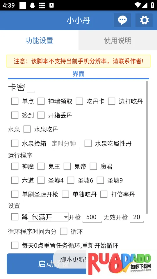 小小丹是一款全功能免费的脚本游戏辅助App。内置详细说明,配置自动保存。有自动签到等功能,悬浮窗控制不影响手机。采用防封技术,能自动重启,可优化画面,还有智能辅助等优势,提升玩家游戏体验。