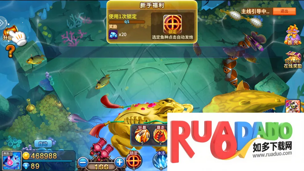 3、游戏玩法多样,点击屏幕可向鱼开炮,能使用技能锁定自动发泡,升级炮台可提升捕鱼概率,捕获积分鱼能获积分抽奖,在线久可领金币,新手签到七天能免费领炫酷套装。在这里能感受真实海底世界,体验极致捕鱼乐趣,畅享捕鱼盛宴。