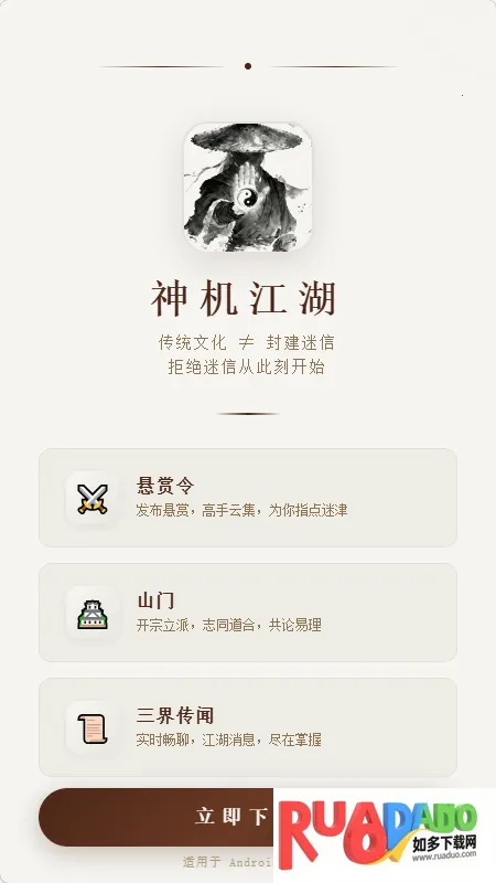 神机江湖是主打传统国学文化交流的趣味社群应用,明确区分文化与迷信,倡导理性学习。有多元功能板块,可发布求助、答疑解惑,还能组建门派、更新资讯、答题巩固学识,以考促学,满足学习需求。